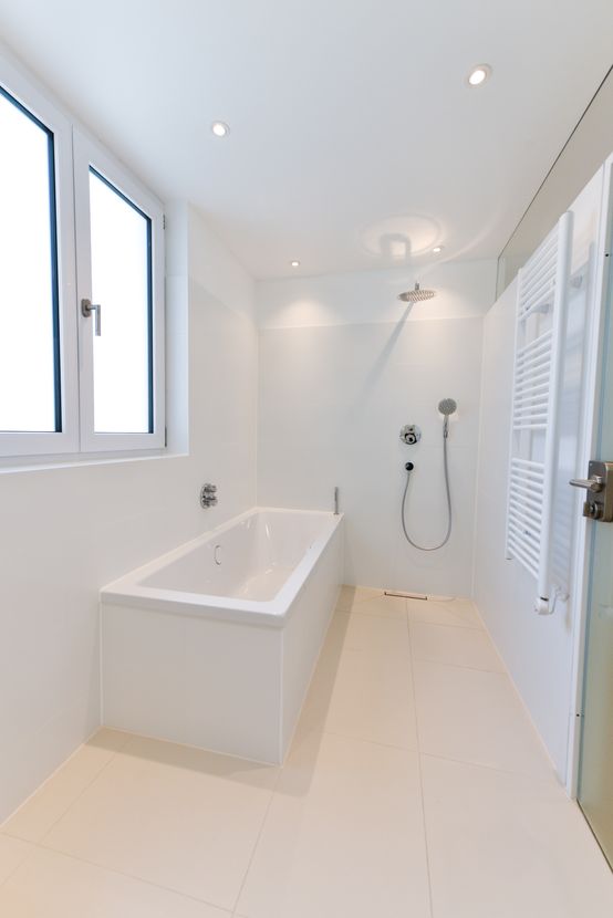 - exklusives Bad mit cremefarbenem Feinstein, Designwaschtisch und Badewanne der Fa. Kaldewei, bodengleiche Walk-In-Dusche mit Rainshower, beleuchtetem Kosmetikspiegel und Handtuch-Heizkörper